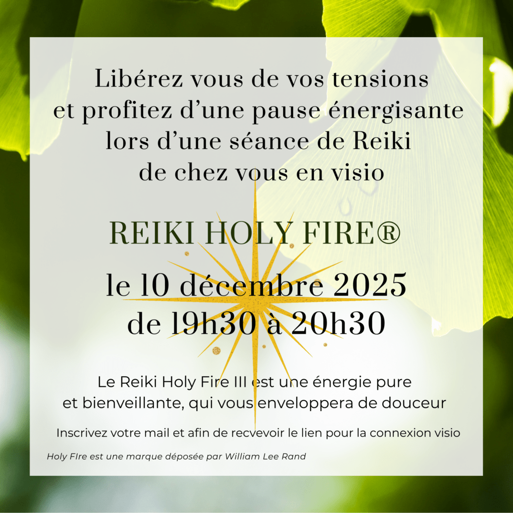 Découvrez la puissance du Reiki Holy Fire® et ses bienfaits, de votre fauteuil lors de notre visio le mercredi 10 decembre à 19h30 Je vous propose de venir vous ressourcer grâce au Reiki, l’énergie Universelle de vie, gracieusement, lors d’une visio durant laquelle je vous ferai vivre une séance de Reiki Holy Fire®. Les bienfaits du Reiki : Durant cette heure, je vous présenterai en quelques mots le REIKI HOLY FIRE et vous guiderai pour vous faire vivre une séance de Reiki, sans sortir de chez vous. Nous prendrons ensuite le temps de partager votre expérience. Pour vous inscrire, il … Lire la suite